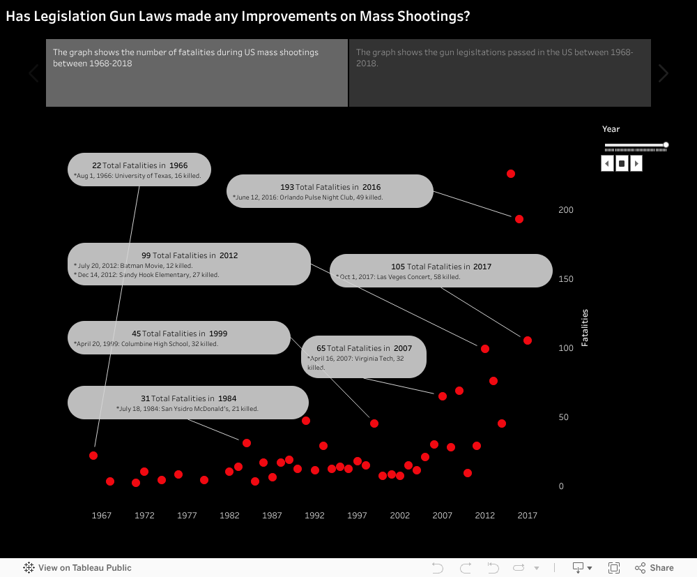 1. 1. The first graph plots the total fatalities per year in mass shootings. The second graph repeates this in a muted tone, and adds a plot for major gun law legislation.